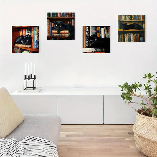 4pcs Vintage Abstract Black Cat Canvas Wall Art Canvas Framed