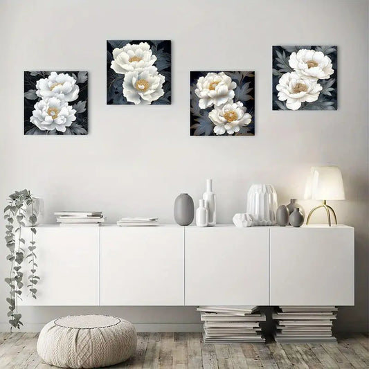 4pcs White Floral Oak Wood Art Wall Art Canvas Framed