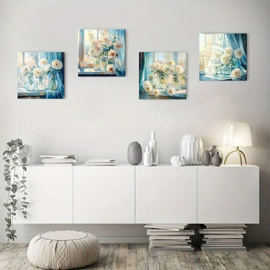 4pcs Daisy Blue Vas Picture Wall Art Canvas Framed