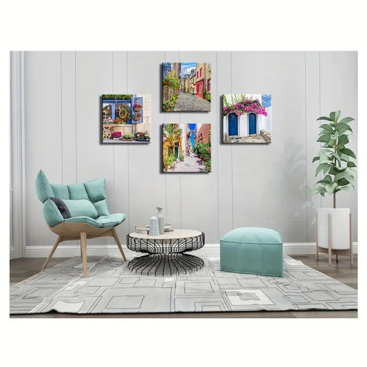 4pcs Colorful European Townscape Wall Art Canvas Framed