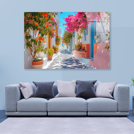 Beautiful Street with Flowers in Greece Acrylic Glass Print Tempered Glass Wall Art 100% Made in Australia Ready to Hang