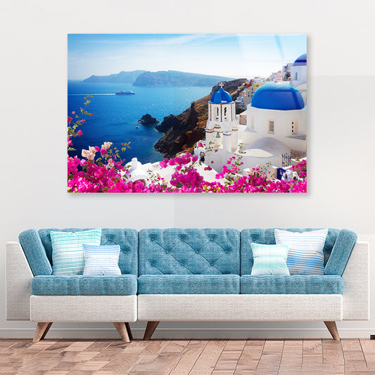 Bougainvillea in the Oia of Coast Acrylic Glass Print Tempered Glass Wall Art 100% Made in Australia Ready to Hang