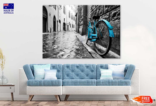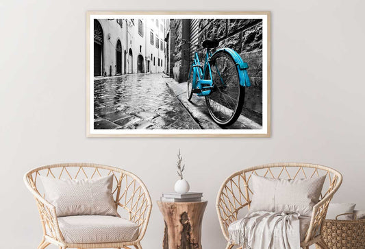 Blue Bike on Old Town Street B&W Photograph Home Decor Premium Quality Poster Print Choose Your Sizes