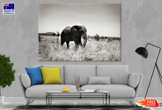 Elephant on Grass Field B&W View Photograph Print 100% Australian Made