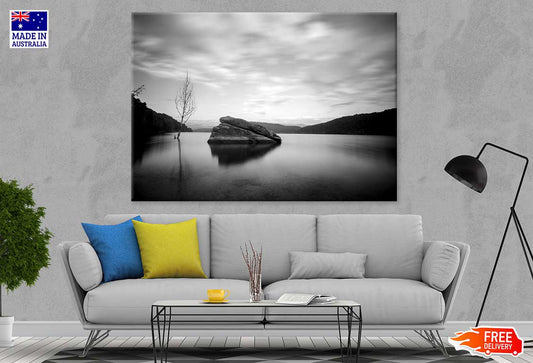 Rock on Lake with Mountains B&W View Photograph Print 100% Australian Made