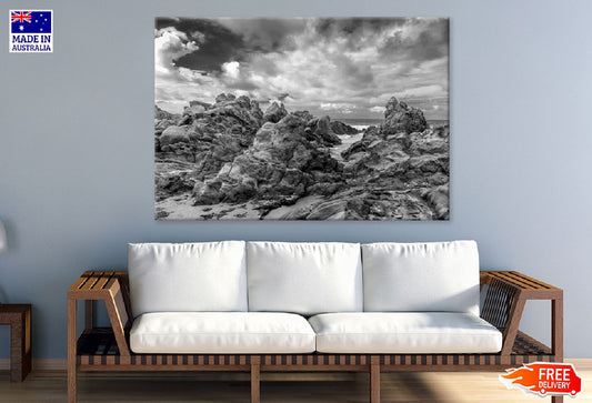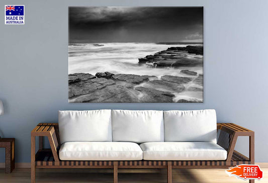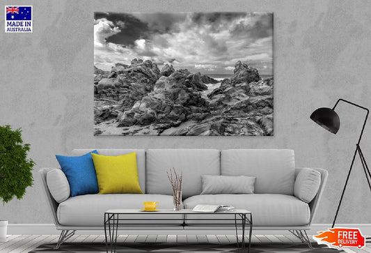 Rocky Sea with Cloudy Sky B&W Photograph Print 100% Australian Made