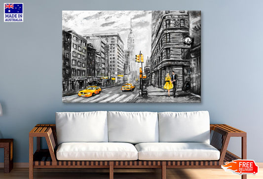 Street View of New York Yellow Taxi & Couple B&W Painting Wall Art Limited Edition High Quality Print