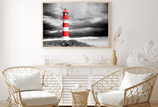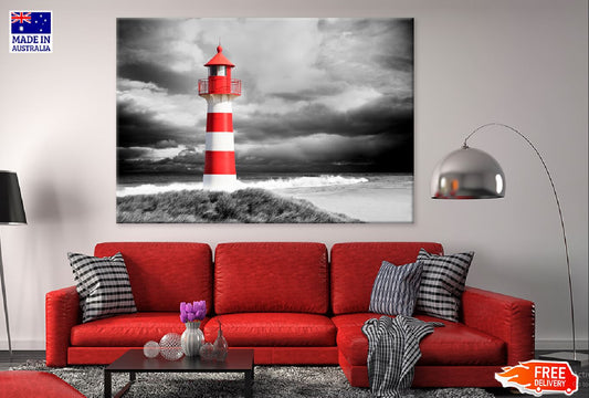 White Red Lighthouse near Sea B&W Photograph Print 100% Australian Made
