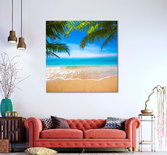 Square Canvas Tropical Beach & Palm Leaves View Photograph High Quality Print 100% Australian Made