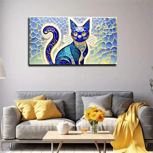 Vibrant Blue & Golden Cat Wall Art Canvas Office Home Room Framed 120x60cm