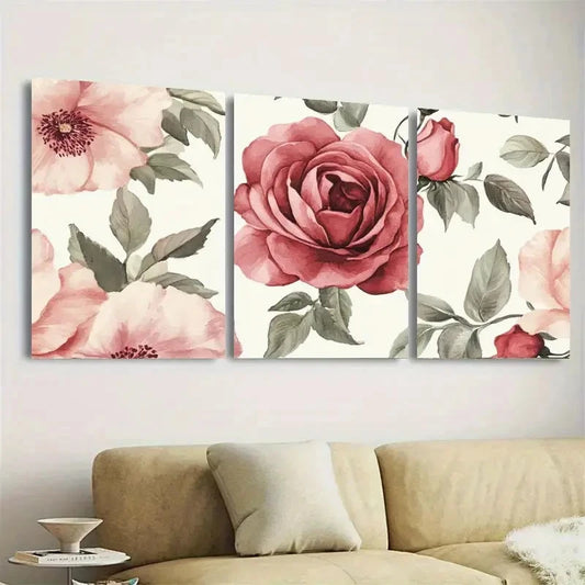 3pcs Pink Roses & Peonies with Green Leaves Wall Art Set Canvas Framed 50x70cm - High Quality Print 100% Australian Made Wall Canvas Ready to Hang