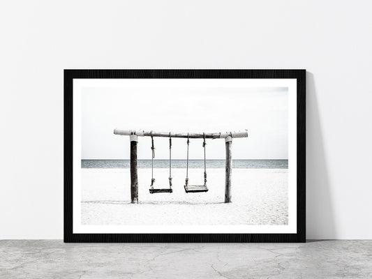 Swing near Sand Beach B&W View Photograph Glass Framed Wall Art, Ready to Hang Quality Print