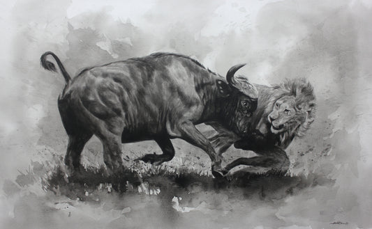 Buffalo & Lion Fighting B&W Painting Print 100% Australian Made