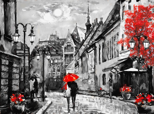 Couple Walking with Red Umbrella B&W Painting Print 100% Australian Made