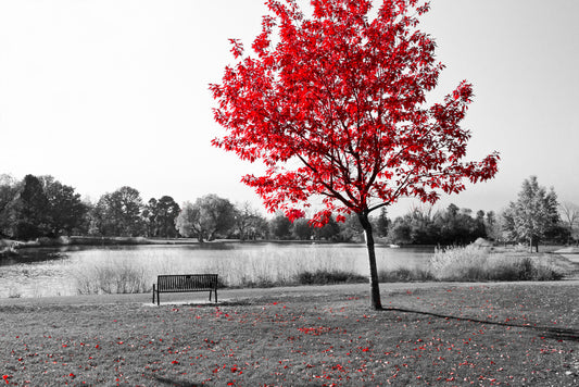 Bench Under Red Leafy Tree Near Lake B&W Photograph Print 100% Australian Made