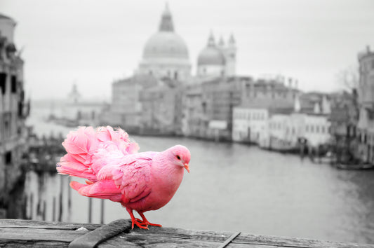 Pink Pigeon On Bridge Railing in Venice Italy B&W Print 100% Australian Made