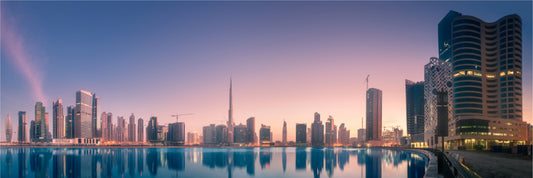 Panoramic Canvas Dubai Business Bay with Reflection of Skyscrapers on Water Sunrise High Quality 100% Australian made wall Canvas Print ready to hang
