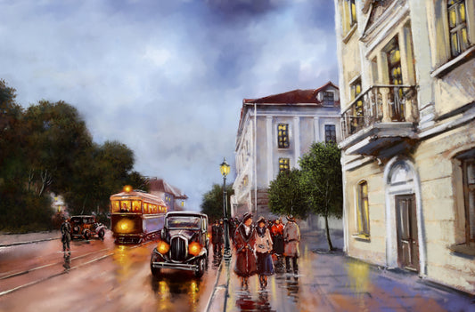 Vintage Street with People & Vehicles Painting Print 100% Australian Made