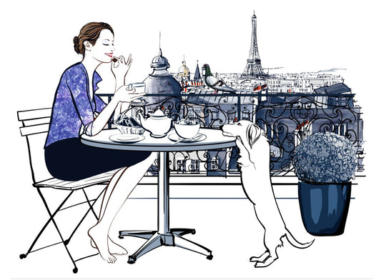 Woman Drinking Tea With Her Dog Eiffel Tower View Painting Print 100% Australian Made