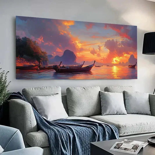 Sunset with Boats Mountain wall canvas office home room framed 120x60cm