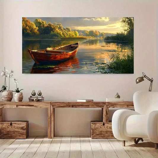 River sunset lonely boat wall canvas office home room framed 120x60cm