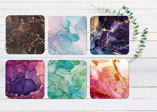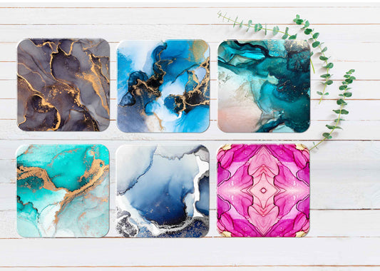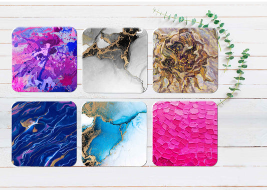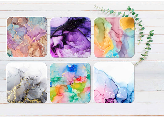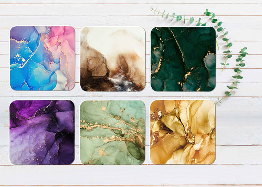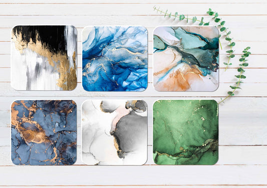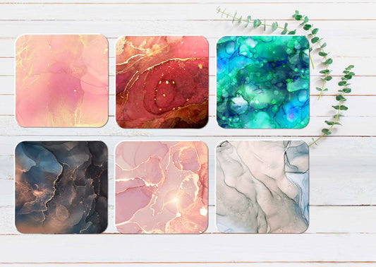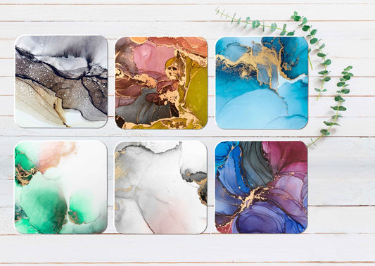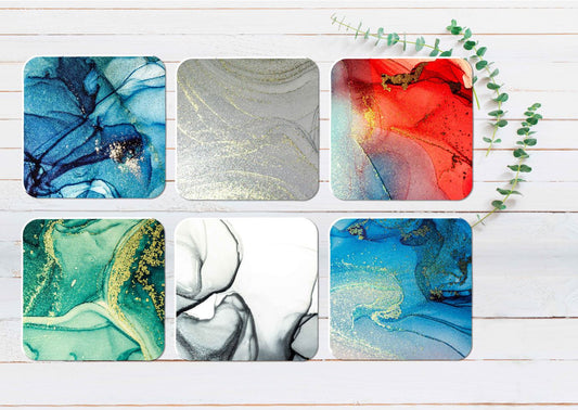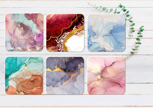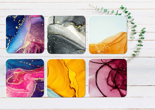 Gold Pink Blue Gree Ink Abstract Coasters Wood & Rubber - Set of 6 Coasters