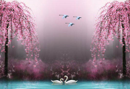 Swans in Lake with Cherry Blossom Trees Print 100% Australian Made