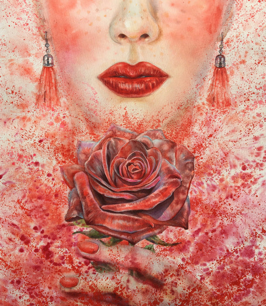 Watercolor Beautiful Girl Holding a Red Rose in Her Hands Painting Print 100% Australian Made