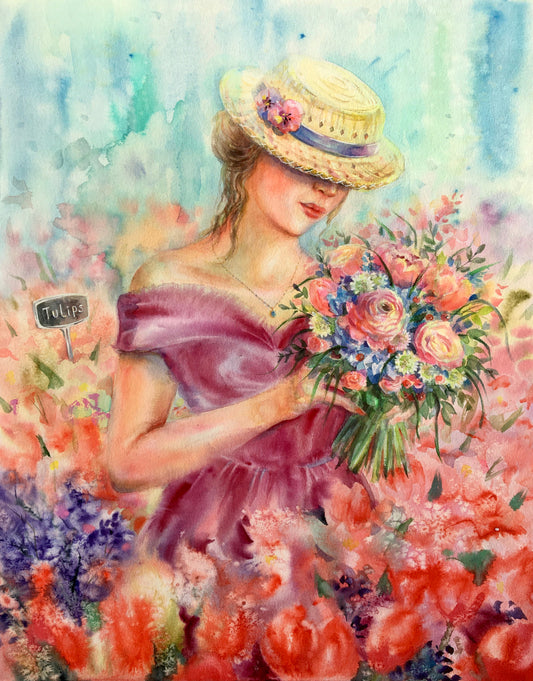 Woman in a Flower Field Holding a Flower Bouquet Painting Print 100% Australian Made