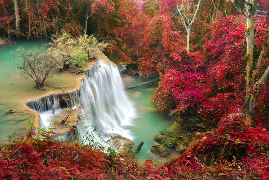 Stunning Waterfall With Red Leafy Trees Photograph Print 100% Australian Made