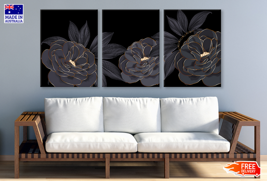 3 Set of Gold & Black Floral Design High Quality print 100% Australian made wall Canvas ready to hang