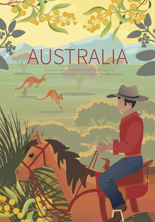 Horse & Rider Looking at Kangaroos Vector Cartoon Art Print 100% Australian Made