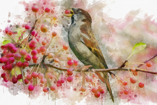 Robin Bird Sitting on a Branch with Flowers Painting Print 100% Australian Made
