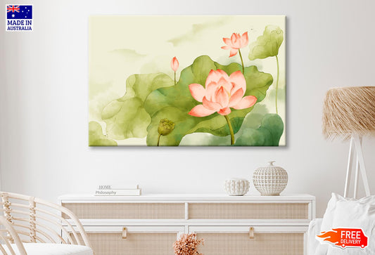 Painting Of a Pink Lotus Flower and Green Leaves Wall Art Decor 100% Australian Made