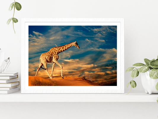 Giraffe Walking On A Sand Dune Glass Framed Wall Art, Ready to Hang Quality Print