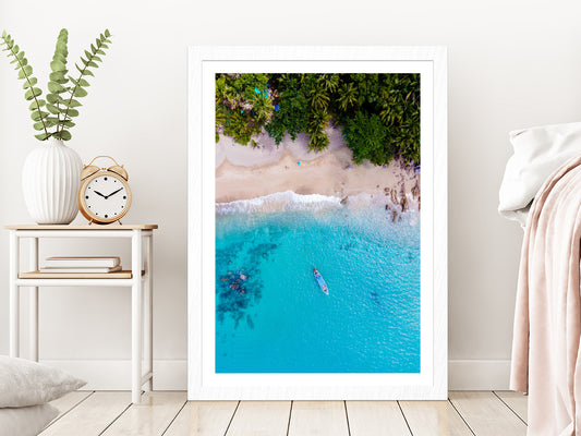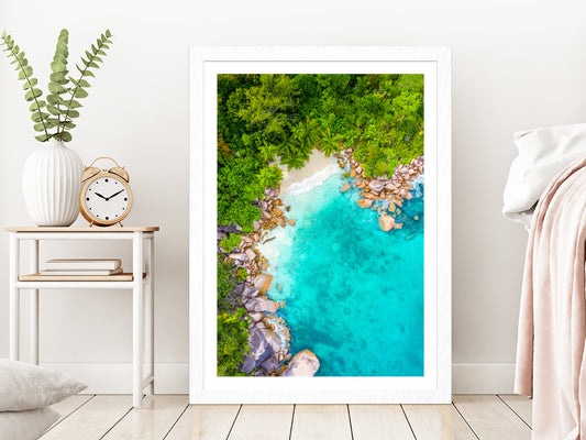 Rocks & Trees near Anse Lazio Beach Aerial Photograph Glass Framed Wall Art, Ready to Hang Quality Print