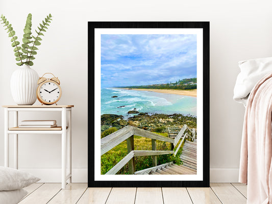 Wooden Pier to Beach & Rocks Photograph Glass Framed Wall Art, Ready to Hang Quality Print