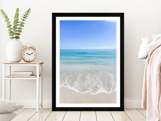 Blue Sky & Beach Waves on Sand Photograph Glass Framed Wall Art, Ready to Hang Quality Print