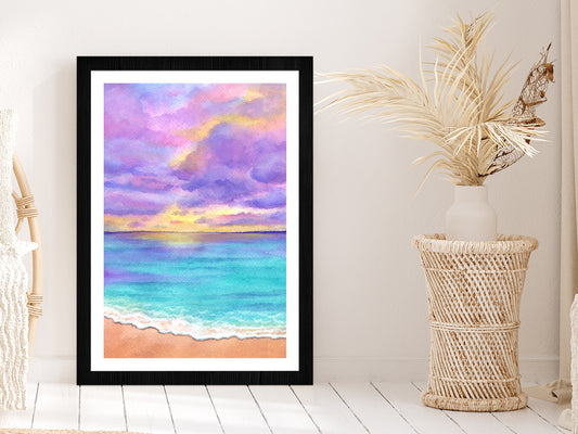 Purple Sunset & Blue Beach Illustration Glass Framed Wall Art, Ready to Hang Quality Print
