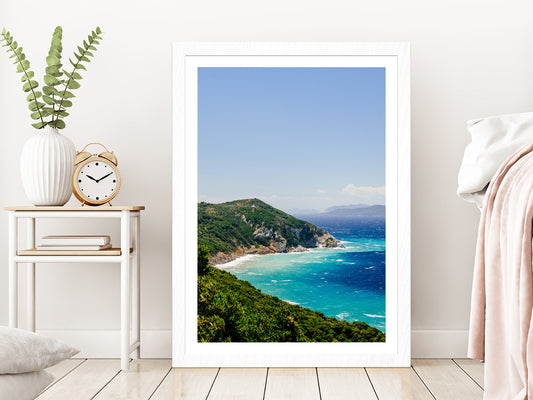 Blue Aegean Sea Coast & Forest Photograph Glass Framed Wall Art, Ready to Hang Quality Print