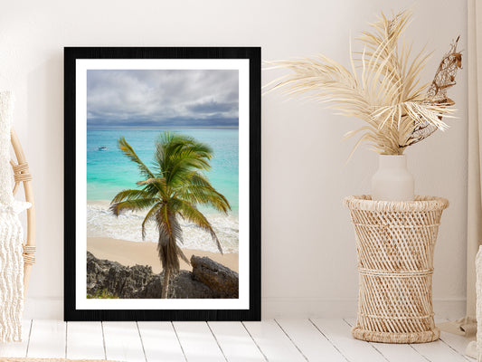 Palm Tree & Rocks near Beach Photograph Glass Framed Wall Art, Ready to Hang Quality Print