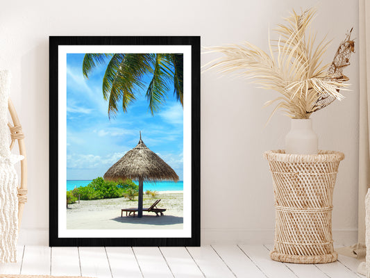 Palm Parasol & Turquoise Sea Photograph Glass Framed Wall Art, Ready to Hang Quality Print