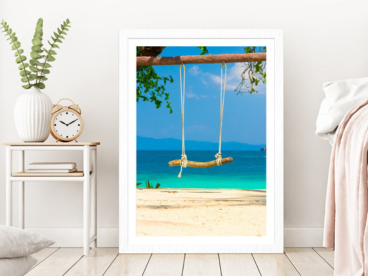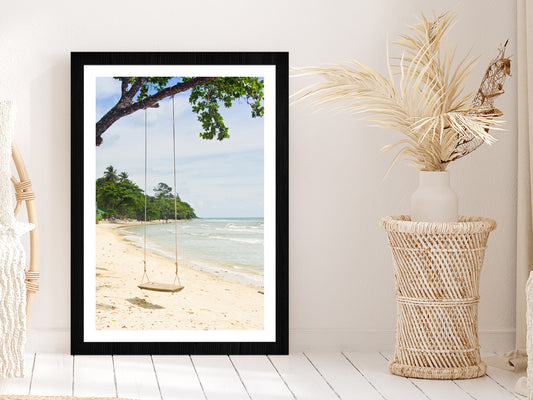Seaside Swing near Sand Beach Photograph Glass Framed Wall Art, Ready to Hang Quality Print
