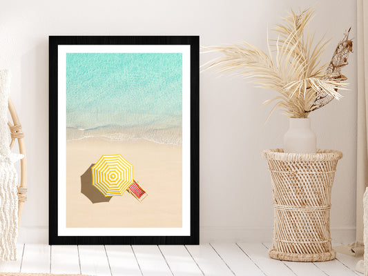 Sunbed & Yellow Umbrella near Sea Aerial View Glass Framed Wall Art, Ready to Hang Quality Print