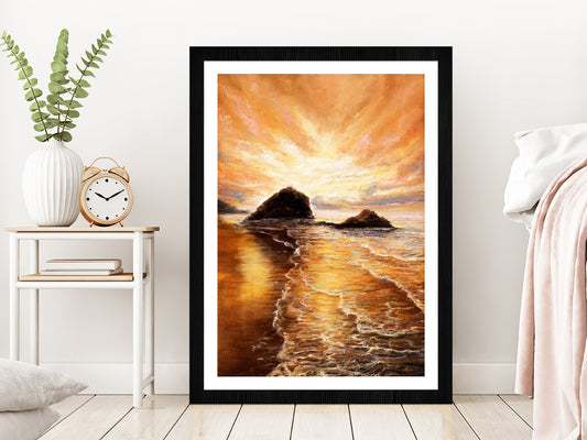 Sunset Over Ocean Beach Oil Painting Glass Framed Wall Art, Ready to Hang Quality Print