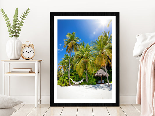 Hammock on Palm Trees & Hut Paradise Beach Glass Framed Wall Art, Ready to Hang Quality Print