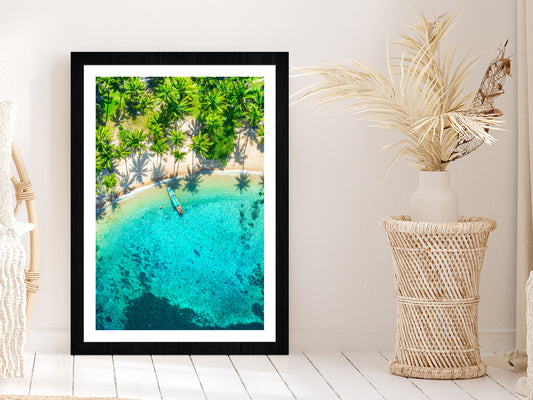 Tropical Beach in Maldives with Palm Trees Photograph Glass Framed Wall Art, Ready to Hang Quality Print