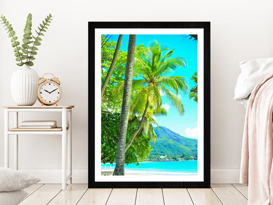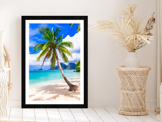Sandy Beach & Palm Tree with Blue Sky View Glass Framed Wall Art, Ready to Hang Quality Print