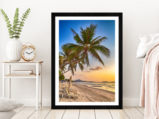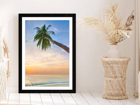 Palm Tropical Beach at Sunset Sky Photograph Glass Framed Wall Art, Ready to Hang Quality Print