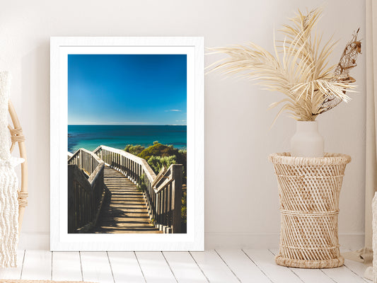 Wooden Staircase & Blue Sky Beach Photograph Glass Framed Wall Art, Ready to Hang Quality Print